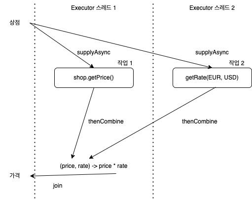 이런 상황에서는 thenCombine 메서드를 사용한다. thenCombine 메서드는 BiFunction을 두 번째 인수로 받는다.thenCombine 또 Async 버전이 존재한다. thenCombineAsync 메서드에서는 BiFunction이 정의하는 조합 동작이 스레드 풀로 제출되면서 별도의 태스크에서 비동기적으로 수행된다.