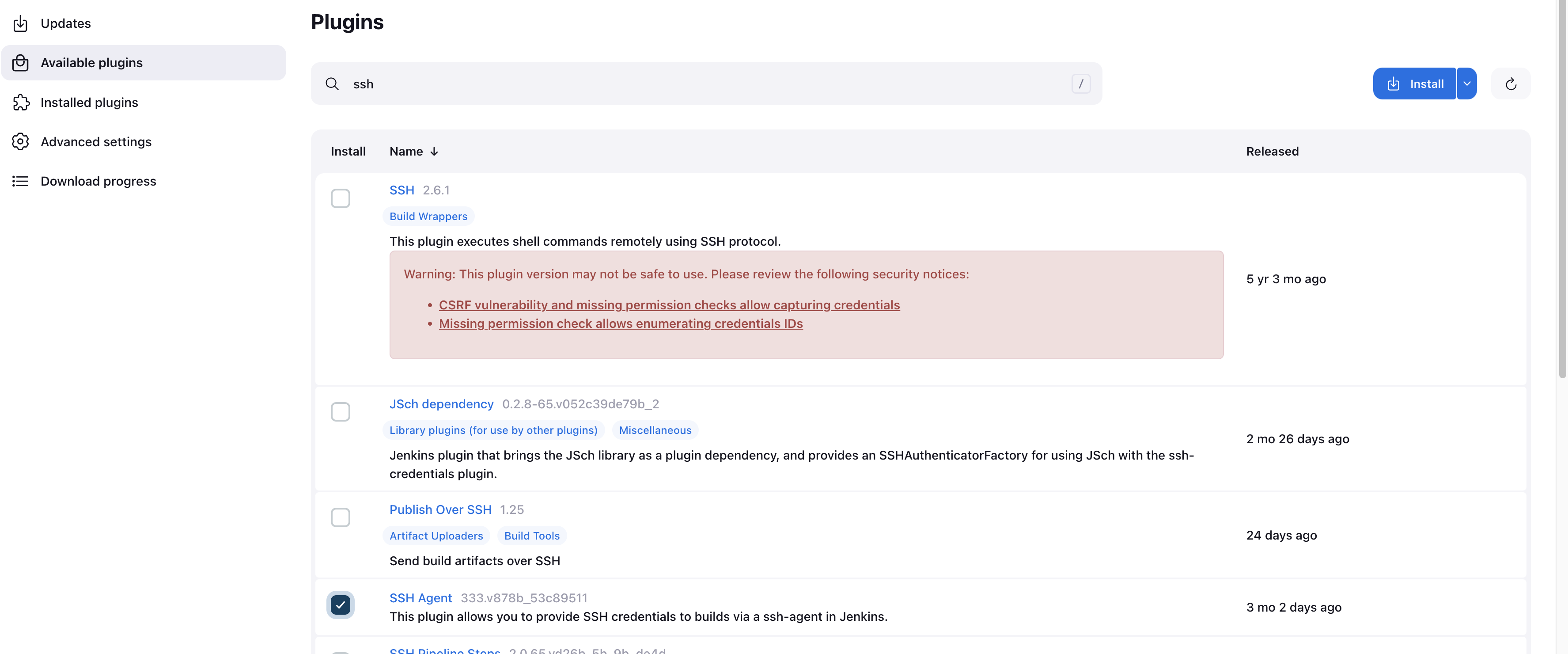 ssh plugin (SSH Agent) 설치 후 jenkins 컨테이너 재시작