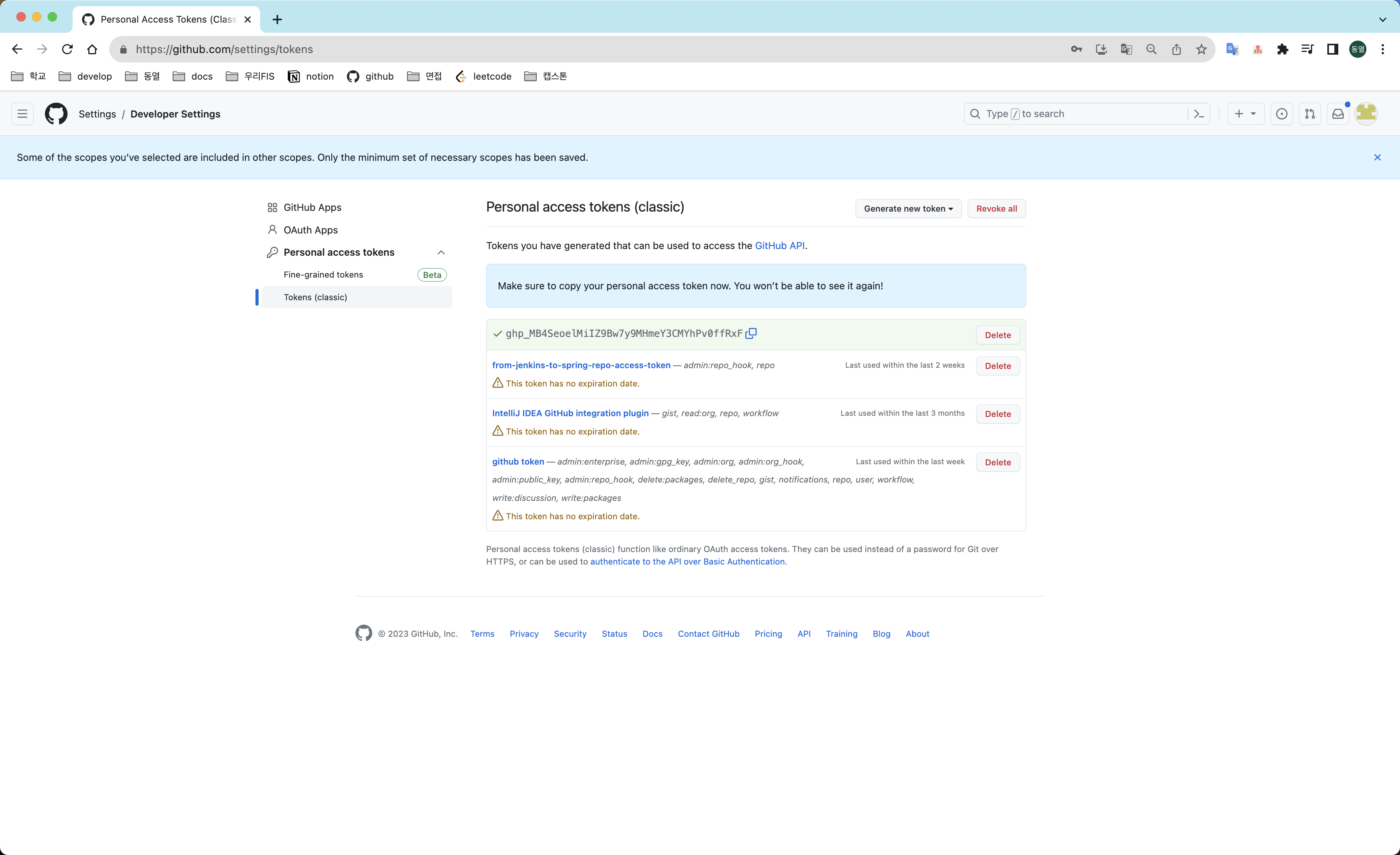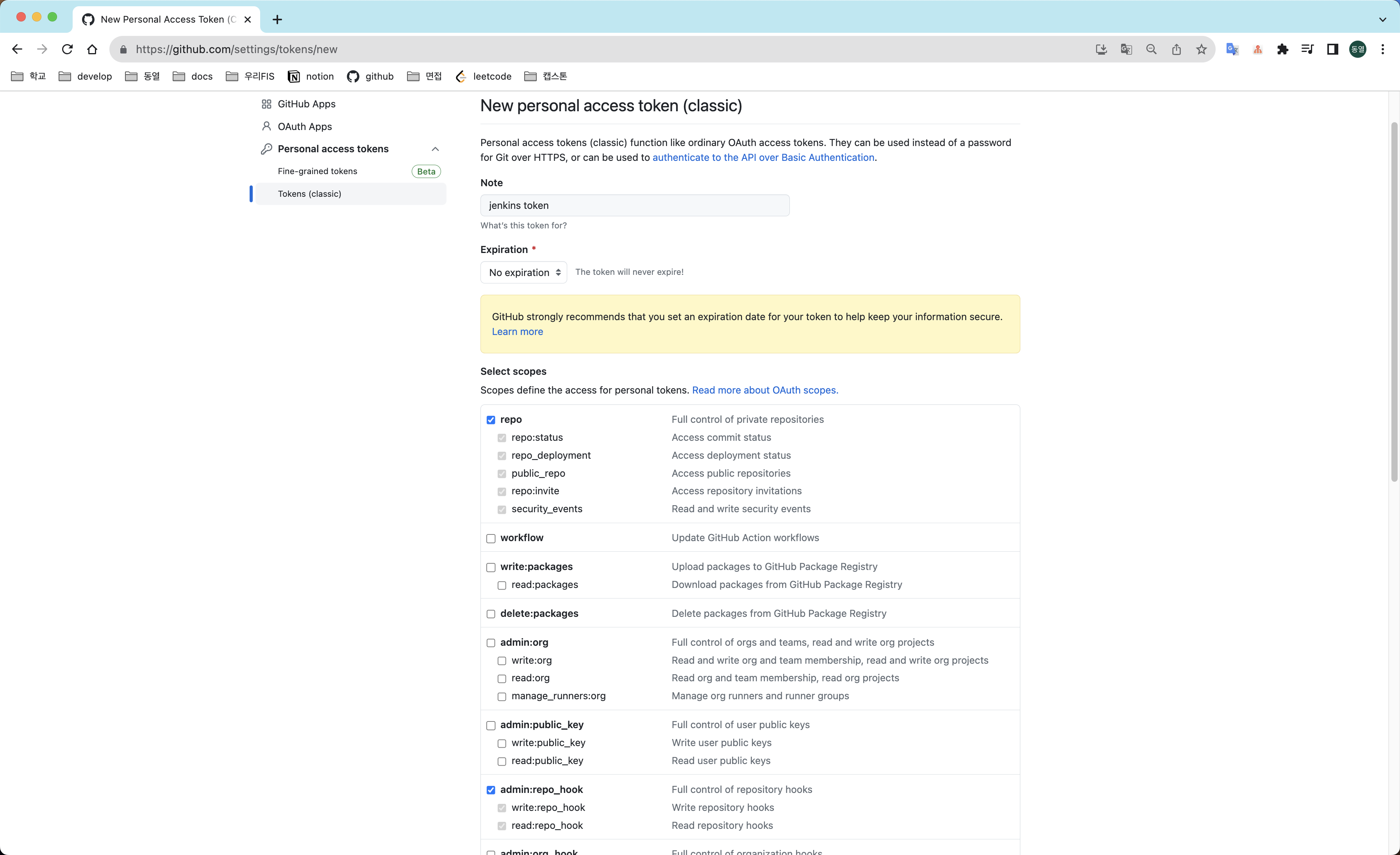 토큰 이름 지정 후 repo, admin:repo_hook 체크