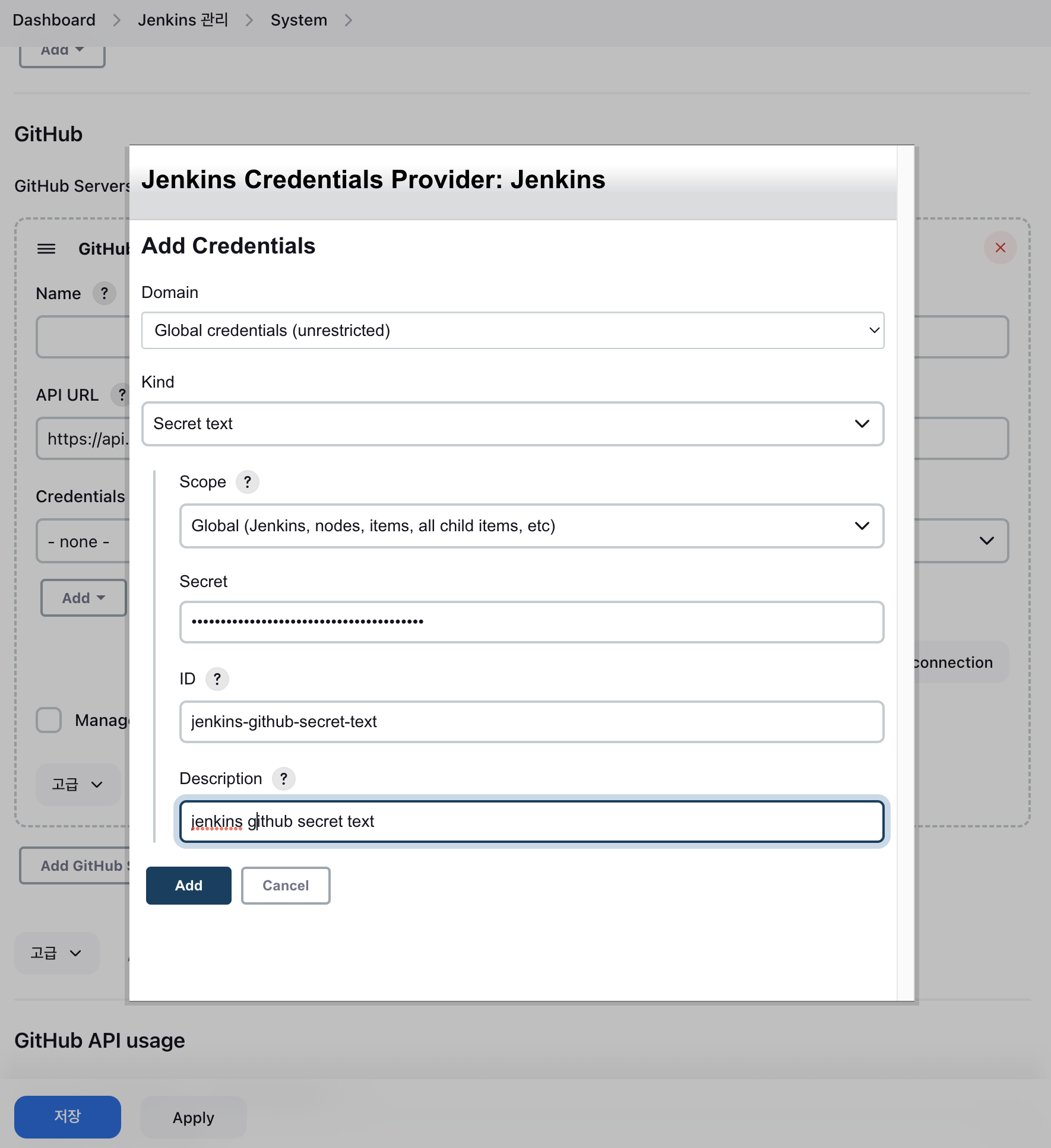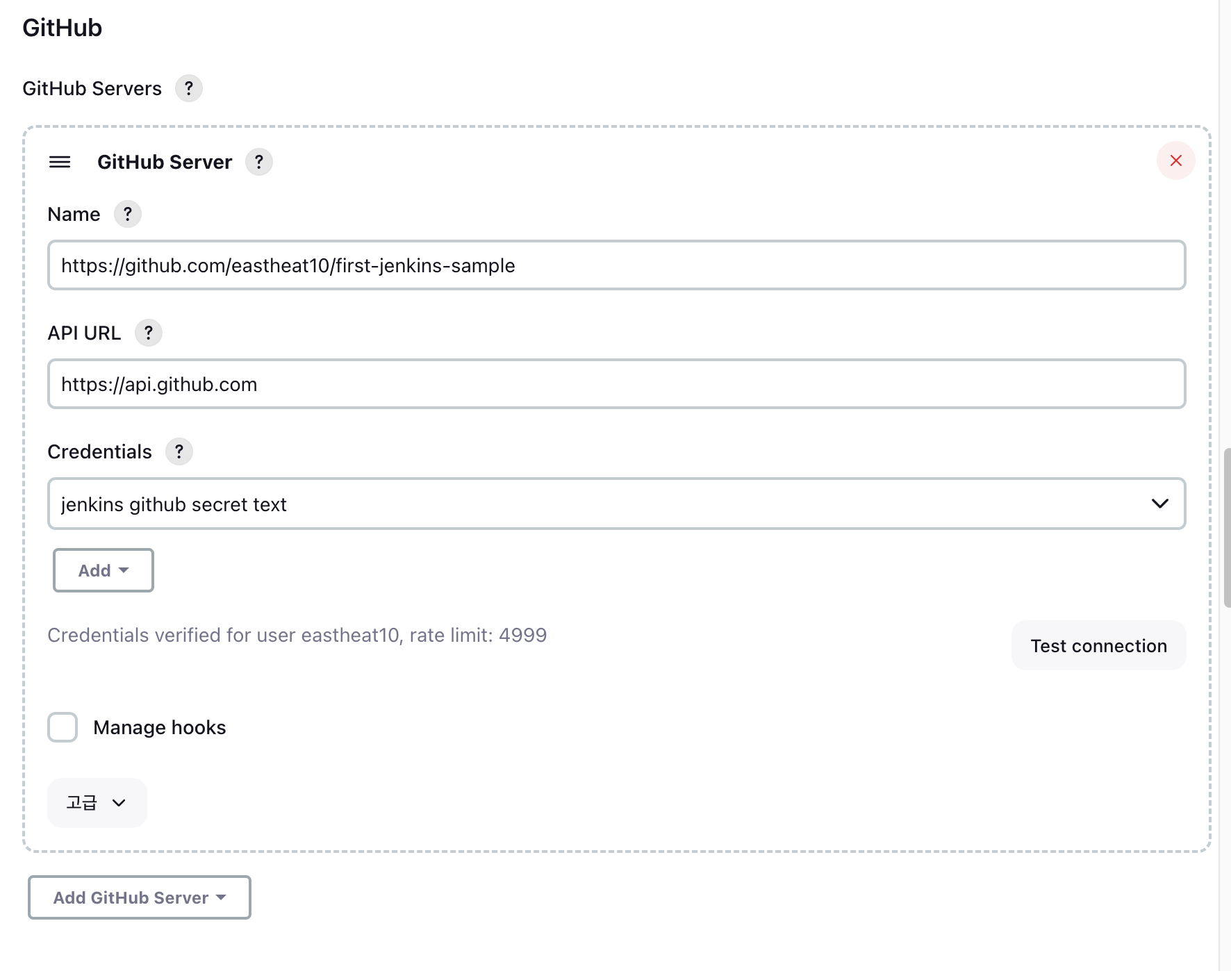 credential에 secret text로 만든 토큰 설정 후 test connection