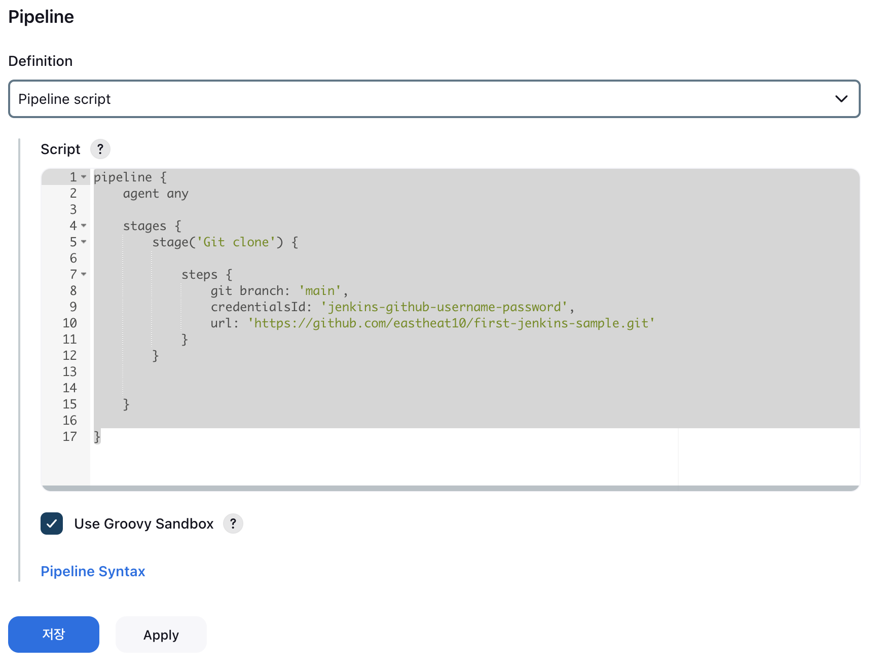 Jenkins에서는 이를 감지하여 script에 작성된 내용을 자동으로 수행하게 된다.