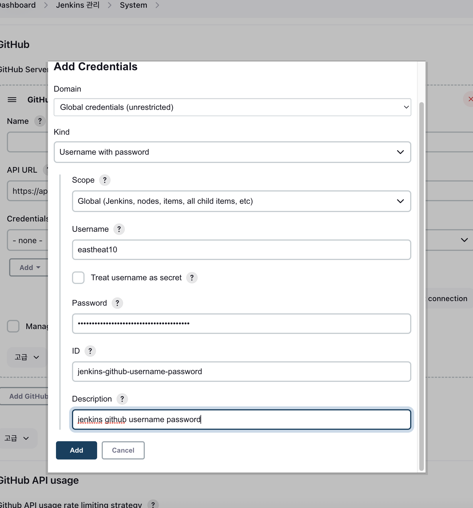 password: 아까 발급받은 ghp_로 시작하는 토큰 Secret에 기입