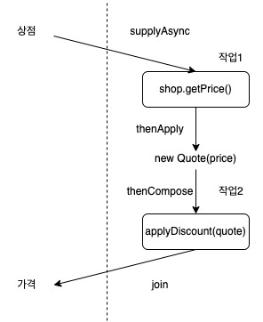 세 번째 map 연산에서는 상점에서 받은 할인 전 가격에 원격 Discount 서비스에서 제공하는 할인율을 적용해야 한다.
