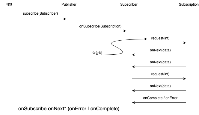 메서드를 제공한다.Publisher는 수많은 일련의 이벤트를 제공할 수 있지만, Subscriber의 요구사항에 따라 역압력 기법에 의해 이벤트 제공속도가 제한된다.Subscriber는 Publisher가 발행한 이벤트의 리스너로 자신을 등록할 수 있다.Subscription는 Publisher와 Subscriber 사이의 제어흐름, 역압력을 관리한다.